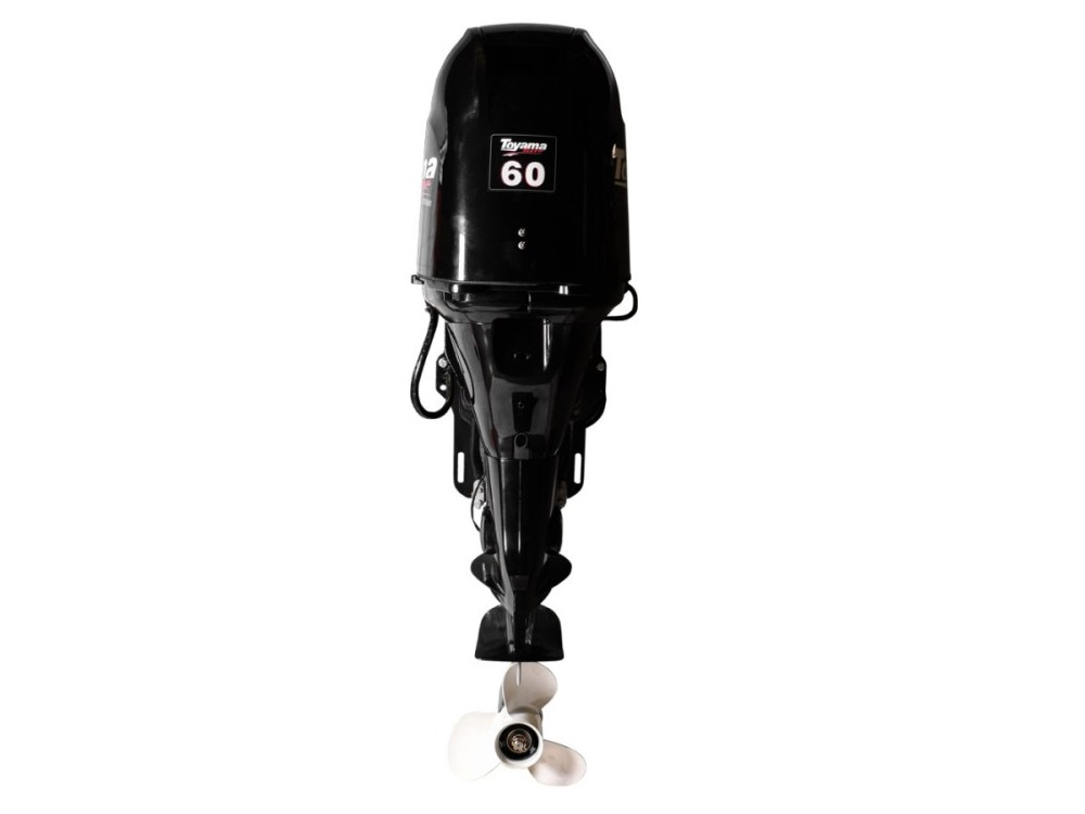 Подвесной лодочный мотор Toyama мощностью 60 л.с. для больших лодок и катеров длиной 6-8 метров. Выводит на глиссирование тяжелые нагрузки, держит высокую скорость при волнении. Двухтактный двигатель легче четырехтактного, дает больше мощности на килограмм веса.